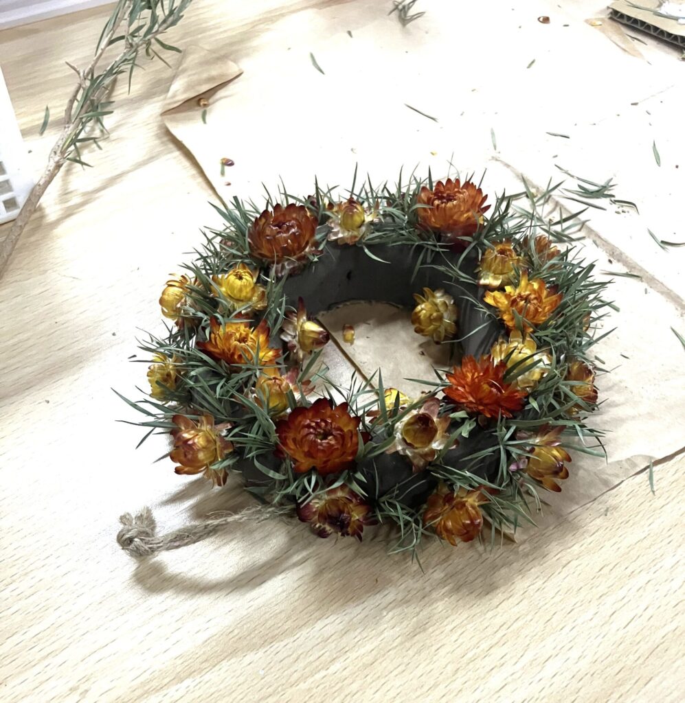 水やりや日々の観察を重ね、咲いた花を乾燥させ、ひとつひとつバランスを考えながら飾り付けました。自然の色合いを活かした、あたたかみのある作品に仕上がっています。