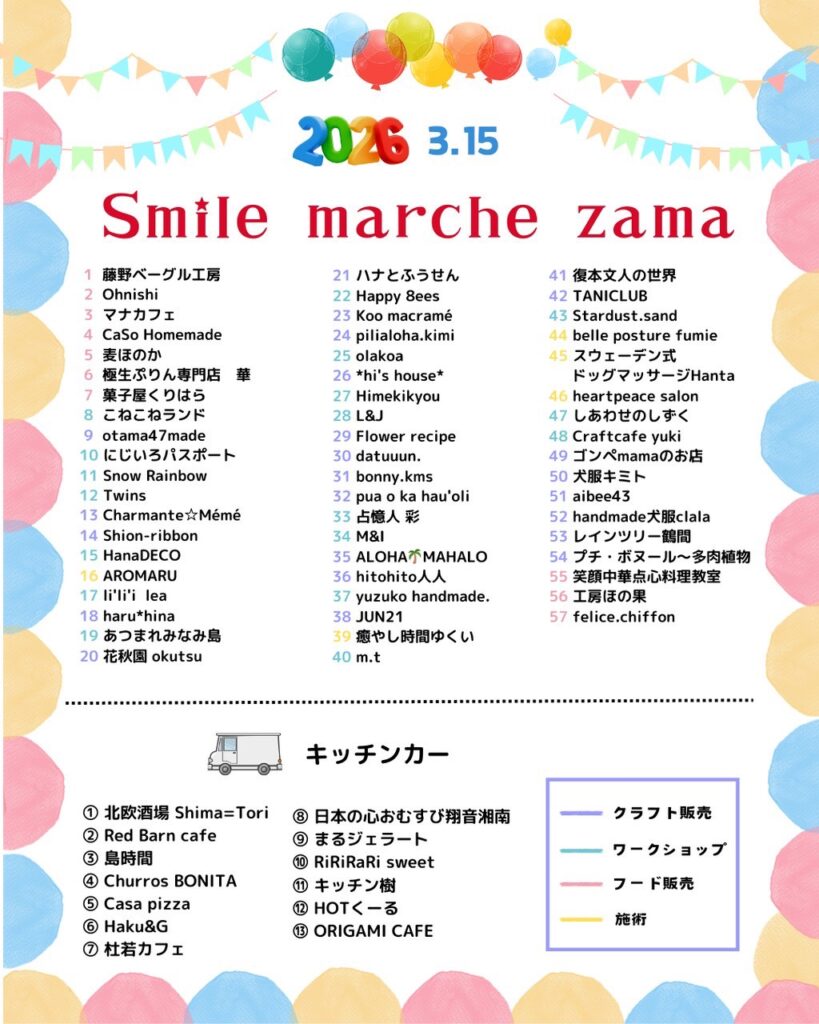 マルシェ出店のお知らせ!3月15日 2026年3月12日2026年3月11日 イベント情報 レインツリーホーミーズの皆様 こんにちは レインツリーからお知らせです😊 3月16日(日)県立座間谷戸山公園にて『smileマルシェ座間』に 出店いたします。皆さんお誘い合わせの上、お越しください。 お待ちしております。以下詳細 場所は53番になります。